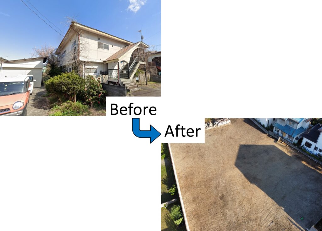会津若松市日新町地内にて、木造住宅1棟、コンクリート造住宅1棟および、敷地内植栽の撤去、立木の伐採・伐根、コンクリート塀などの外構撤去工事を行いました。約500坪を超える敷地内での大規模工事となり、今後も様々な用途で使用できるようになりました。
